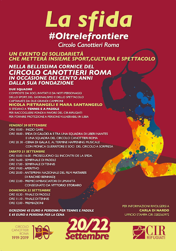 Venerdì 20 settembre alle ore 10:00 avranno inizio le gare di tennis e alle ore 18:00 si svolgerà la sfida di calcio a 5 con i Liberi Nantes ed una squadra del Circolo Canottieri Roma. Venerdì 20 alle ore 20:30 si svolgerà la Cena di Gala con un intrattenimento di Monica Guerritore. Al termine della cena verranno consegnati i premi Ambasciatori di umanità a Tiziana Ferrario, a Neri Marcorè e ad Andrea Purgatori che hanno sostenuto la campagna televisiva del CIR #Oltrelefrontiere.