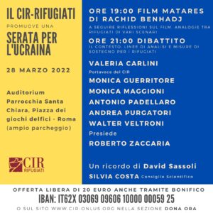 Per partecipare all’evento chiediamo un contributo di 20 euro che sarà devoluto per sostenere le attività del CIR nell’ambito di questa drammatica emergenza, in particolare a favore di mamme e bambini da pochissimo giunti in Italia.